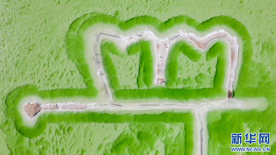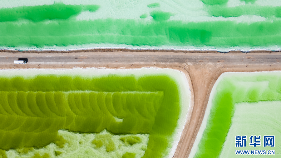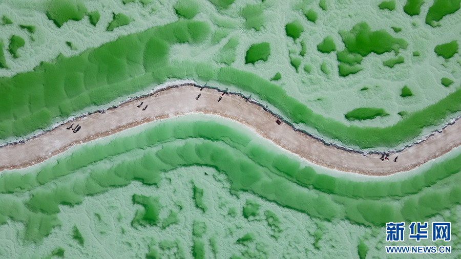 茫崖翡翠湖位于青海省海西蒙古族藏族自治州茫崖市花土溝鎮,屬于硫酸鎂亞型鹽湖,由于所含礦物質濃度的不同,在陽光的映照下,湖水呈現出深淺不一的翠綠色,就像無數塊翡翠鑲嵌在大地上。從無人機視角望去,茫崖翡翠湖宛如色彩絢麗的油畫,清新的色澤,甜蜜又夢幻。