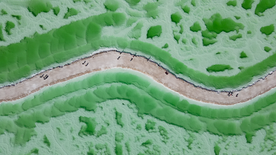 白色的鹽晶沿著湖岸線分布,形成獨特的紋理。