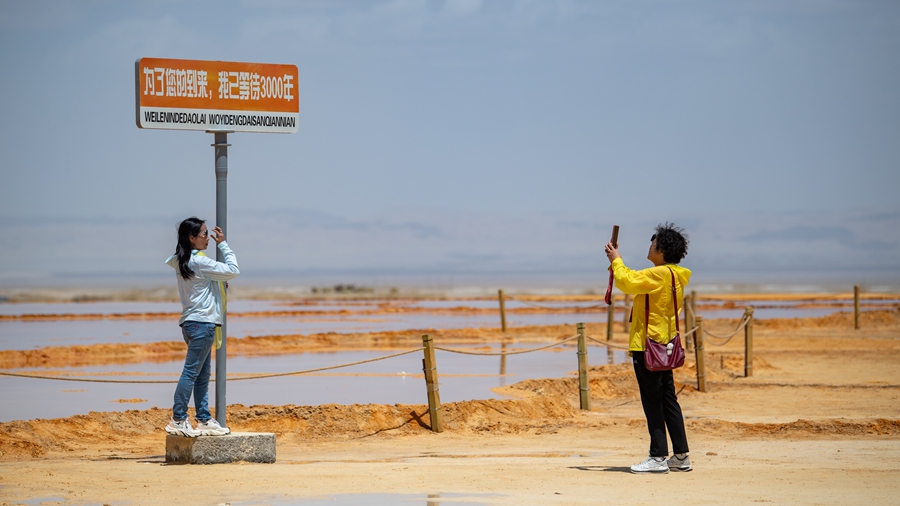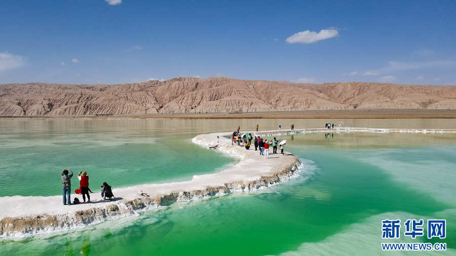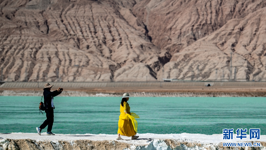 5月19日,專列游客在茫崖市翡翠湖景區游玩。