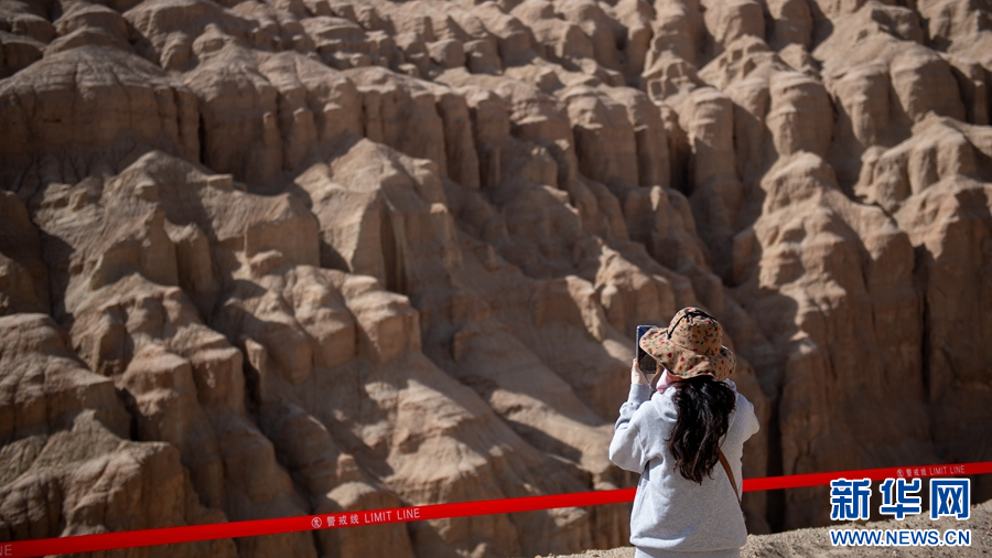 5月19日,一名專列游客在茫崖市千佛崖景區拍照留念。
