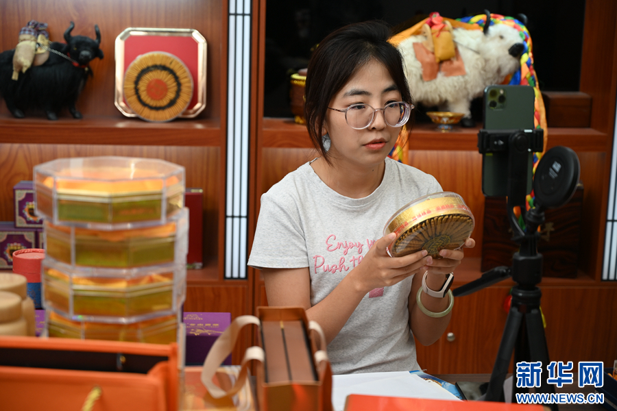 在青海助農電商人才孵化基地,工作人員正在直播帶貨,介紹青海特產。