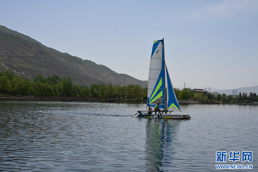 在北川河濕地公園,工作人員演示北川濕地機帆船項目。