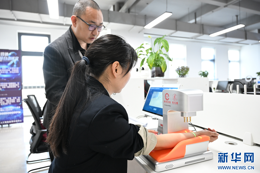 在青海人工智能應用示范中心,工作人員向采訪團記者介紹健康數字診療儀使用方法。