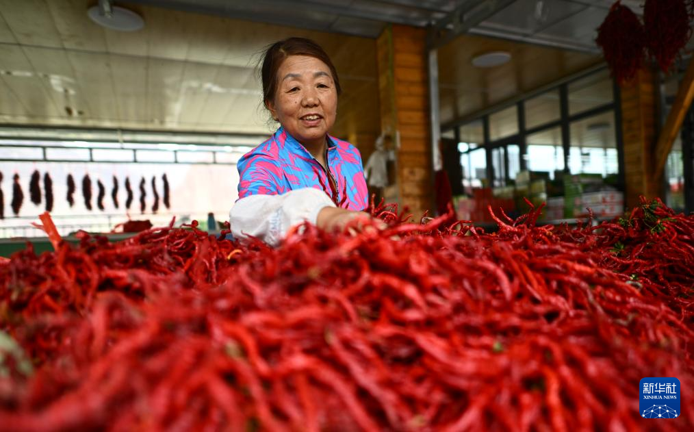 9月11日,在青海省海東市循化撒拉族自治縣清水鄉下灘村,村民整理線辣椒準備晾曬。