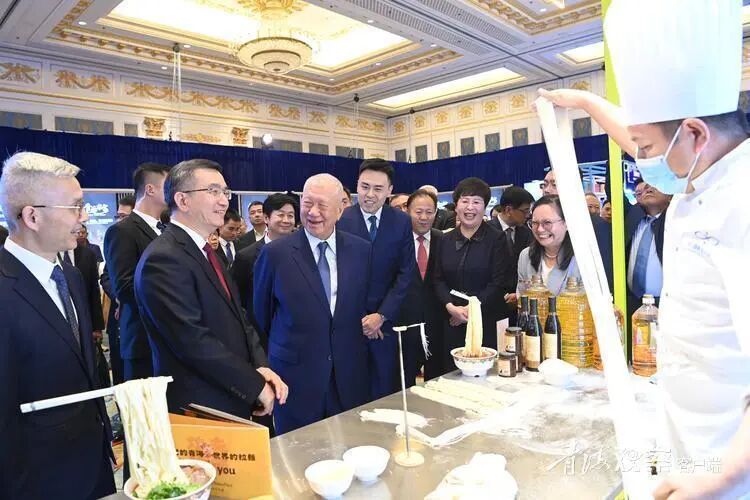 10月28日,2025青?!拈T經貿交流合作推介會在澳門舉行。圖為,全國政協副主席何厚鏵,省委副書記、省長羅東川等嘉賓在活動現場參觀青海拉面的展示。青海日報融媒體記者 祁國彪 攝