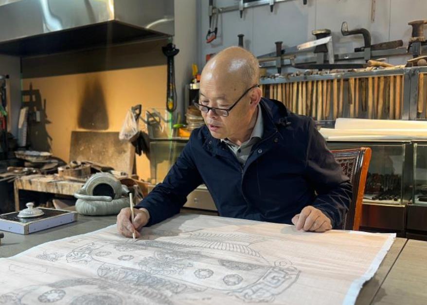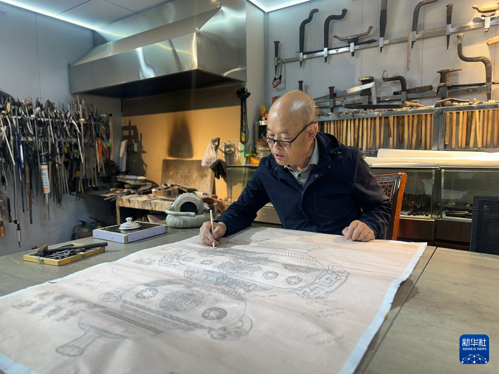 銀銅器制作及鎏金技藝國家級代表性傳承人何滿正在繪圖。新華社記者 張子琪 攝