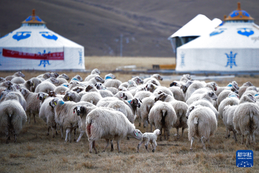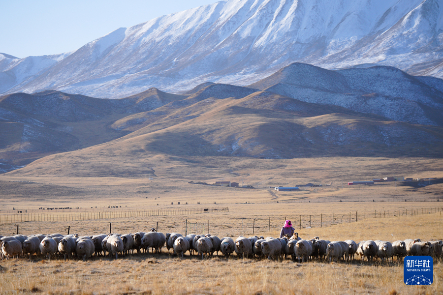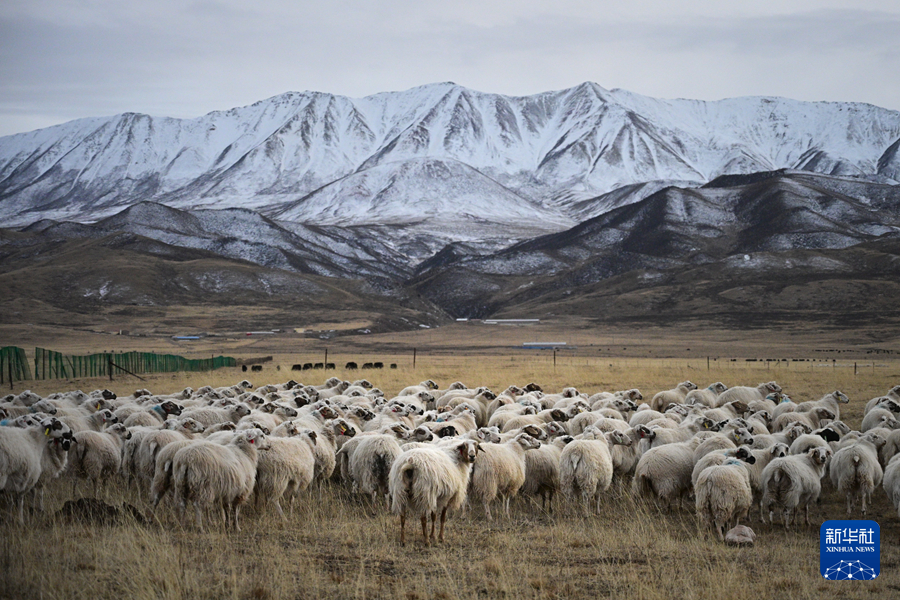 這是11月9日在青海省海北藏族自治州祁連縣仟戶牧場草場拍攝的無角藏羊羊群。
