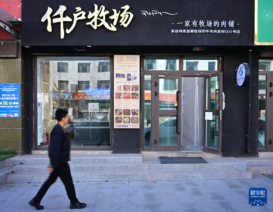 11月11日,葉旦多杰走過位于青海省海北藏族自治州祁連縣仟戶牧場的銷售門店。