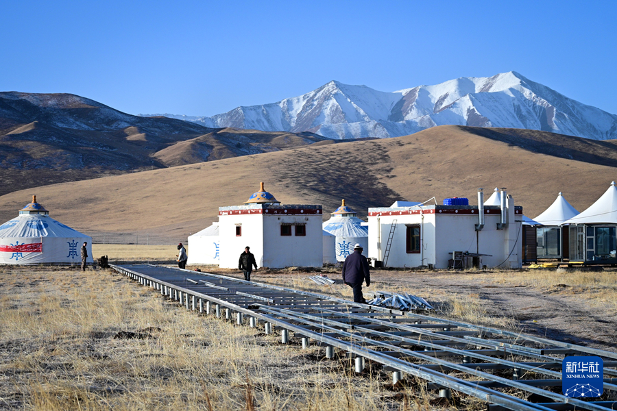 11月10日,工人在青海省海北藏族自治州祁連縣仟戶牧場的牧旅營地施工。
